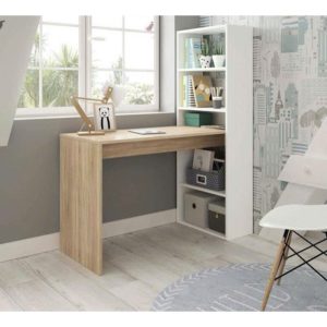 – Bàn làm việc được tích hợp kèm kệ sách là một thiết kế vừa đơn giản nhưng không kém phần mới mẻ, bắt mắt. Kệ sách được đặt bên hông bàn làm việc vừa có thể làm một bên chân vững chắc và nhìn bàn trông cứng cáp hơn.