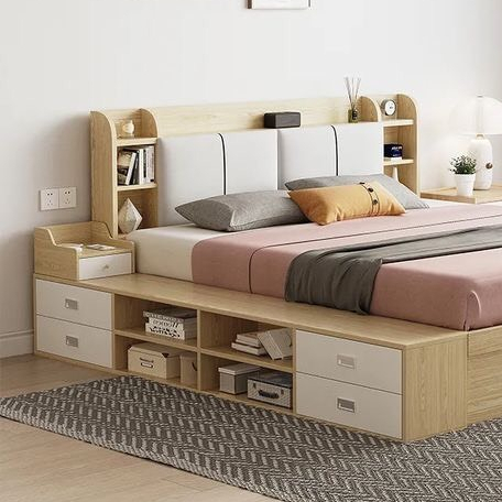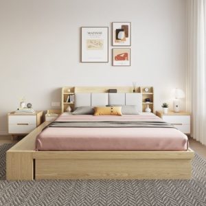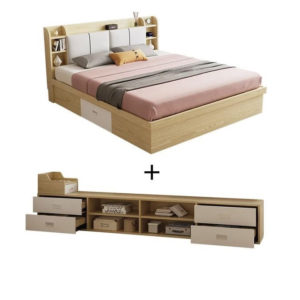 1. TÊN SẢN PHẨM: GIƯỜNG NGỦ GỖ CÔNG NGHIỆP PHỦ MELAMINE CAO CẤP, SANG TRỌNG GIÁ RẺ TỪ XƯỞNG – KẾT HỢP TỦ SÁCH CÓ NHIỀU NGĂN VÀ HỘC TỦ – CÓ KỆ ĐẦU GIƯỜNG VÀ LỚP ĐỆM TỰA LƯNG.